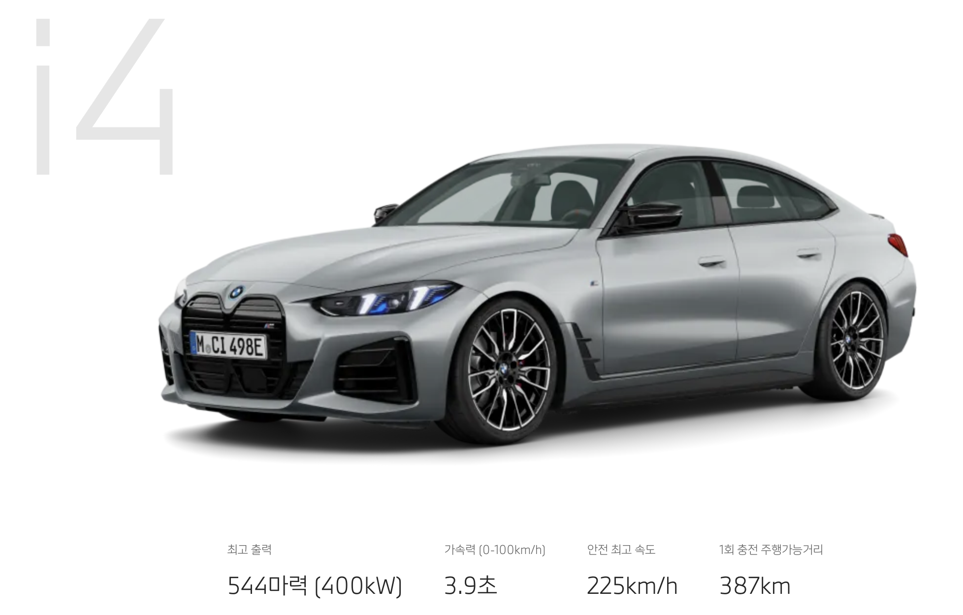 BMW 뉴 i4 M50 xDrive는 고성능 전기차 시장에서 한층 프리미엄을 강조한 그란 쿠페로, 성능·디자인·주행거리 모두 뛰어난 균형을 갖춘 모델입니다.