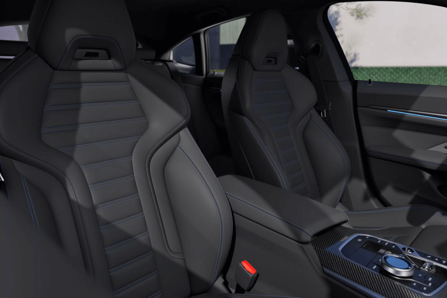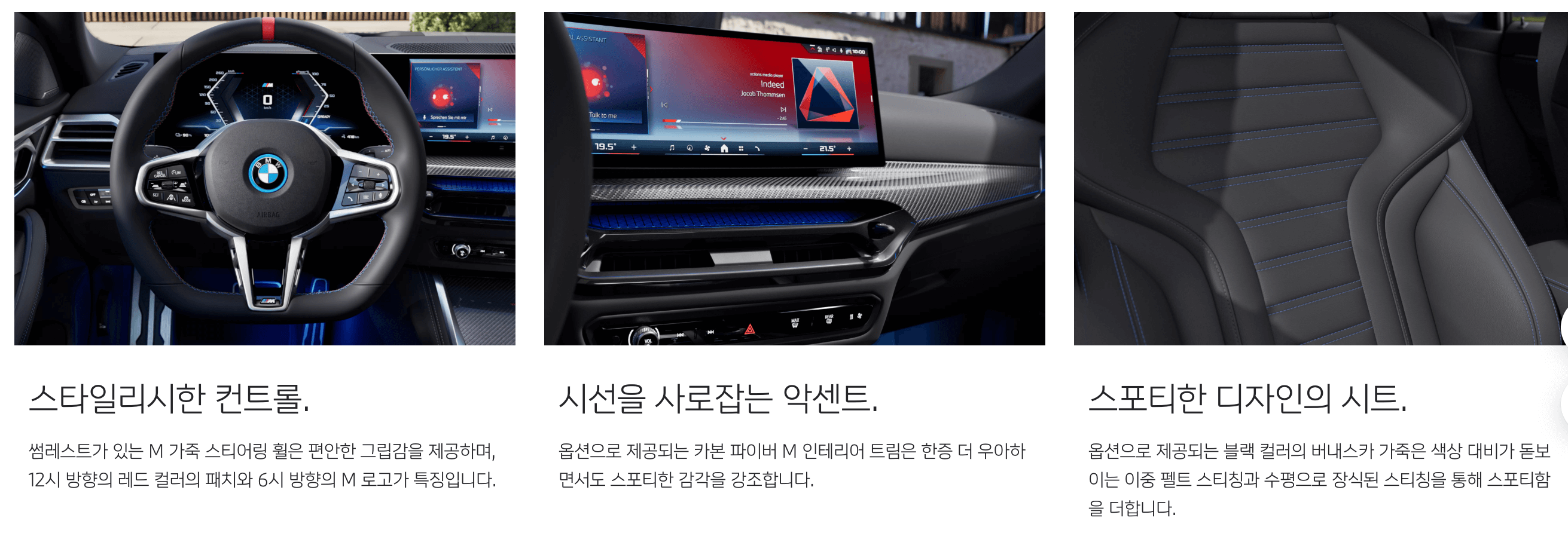 전면에는 BMW M 전용 가로형 키드니 그릴이 적용되어 정체성과 역동적인 이미지를 강조합니다. 일반 i4와는 확연히 구분되는 스포티한 외형은 BMW 특유의 디자인 철학을 유지하면서 전기차의 미래지향적 분위기를 더했습니다.