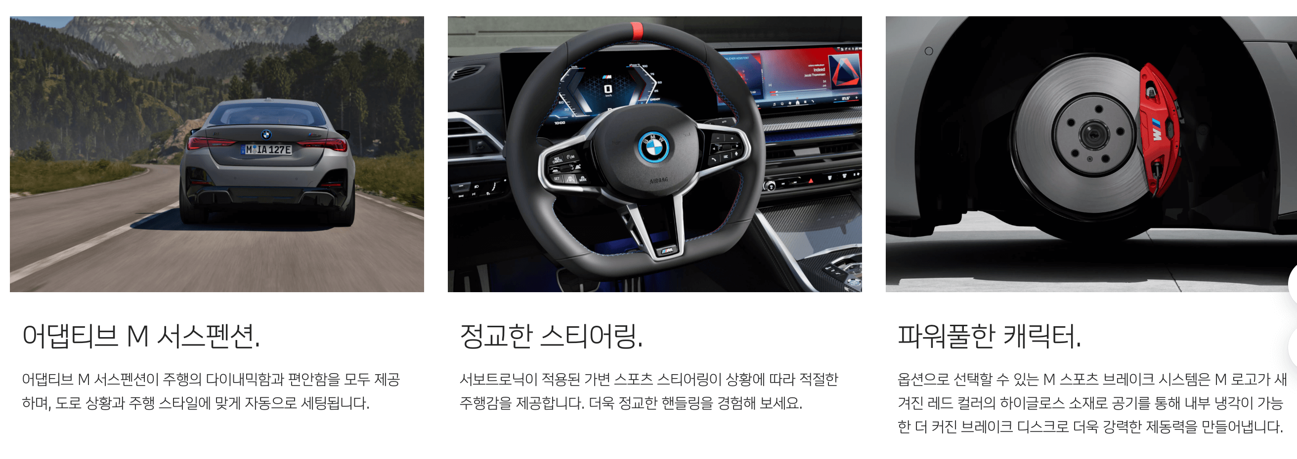 뉴 i4 M50 xDrive에는 어댑티브 M 서스펜션이 적용되어 감쇠력 조절 기능을 통해 노면 반응에 따라 최적의 주행 환경을 제공합니다.3-3. eDrive 시스템과 주행 효율성