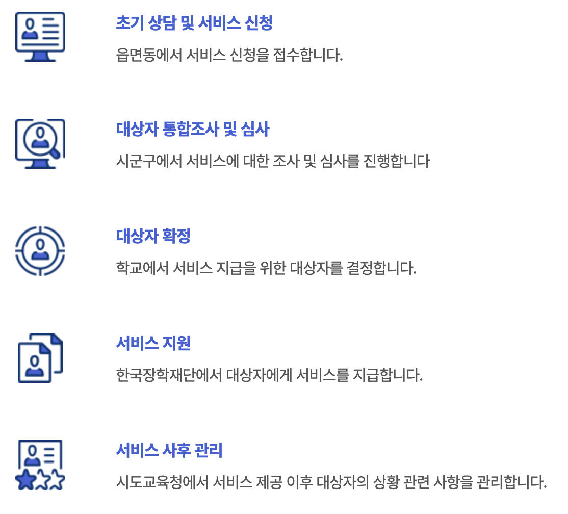 - 거주지 행정복지센터 또는 온라인 누리집(복지로, 교육비원클릭신청시스템)에서 신청 가능합니다.
