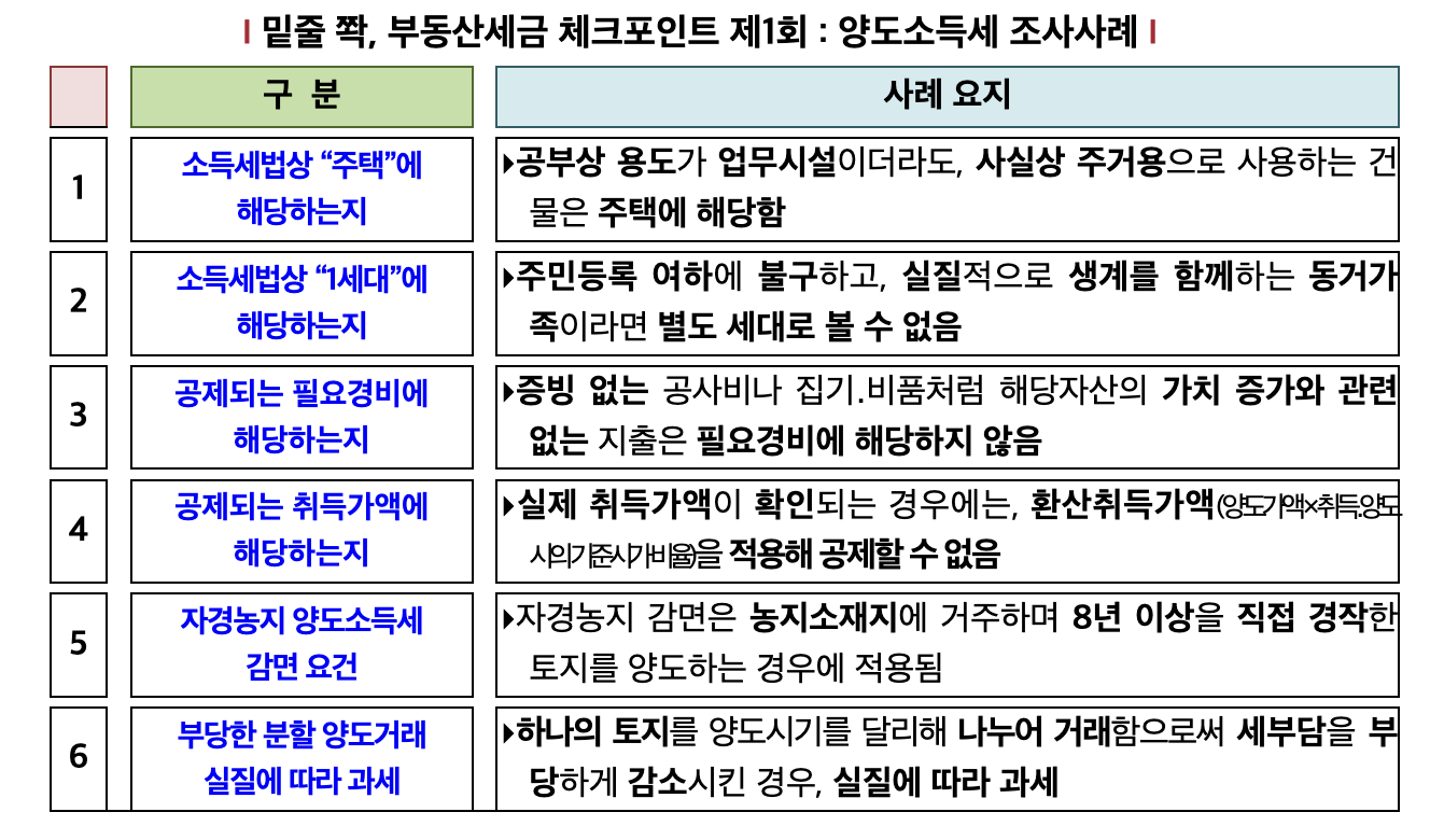 국세청이 발표한 양도소득세 세무조사 사례를 통해 반복적으로 문제가 되는 주요 사례와 꼭 확인해야 할 체크포인트를 정리해보겠습니다.